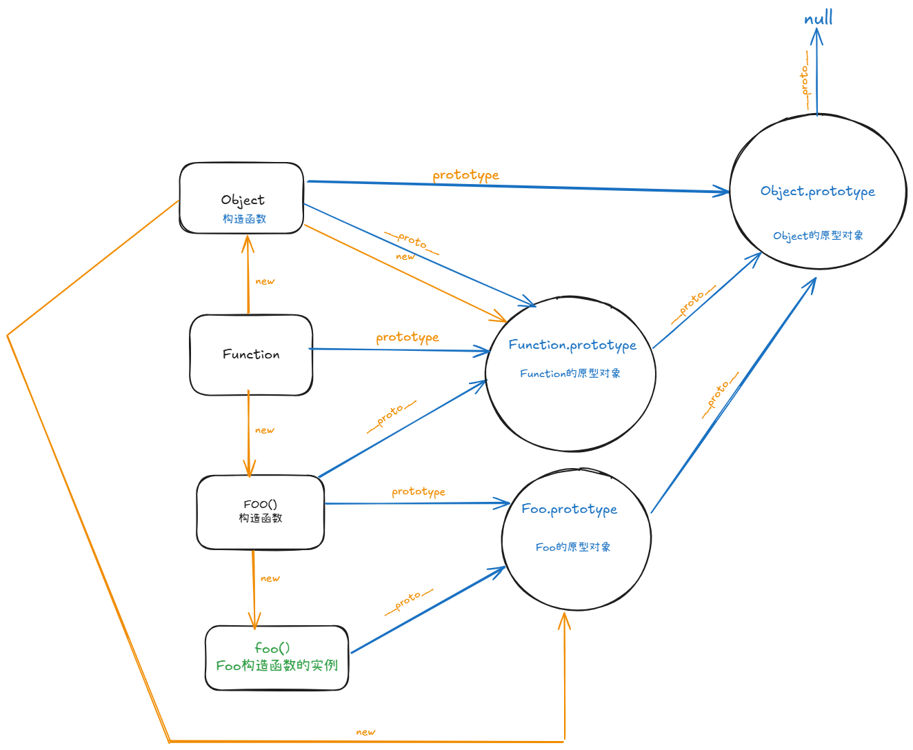 prototype属性。 __proto__链的尽头是Object.prototype--> 这个对象的__proto__属性是null。- 原型链就是顺着