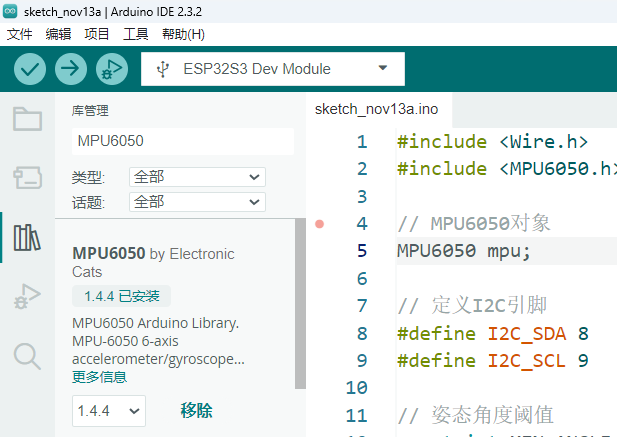 本代码是读取mpu6050的数据,然后根据数据输出1,2,3,4,5,6,让mpu6050当色子。需要安装库