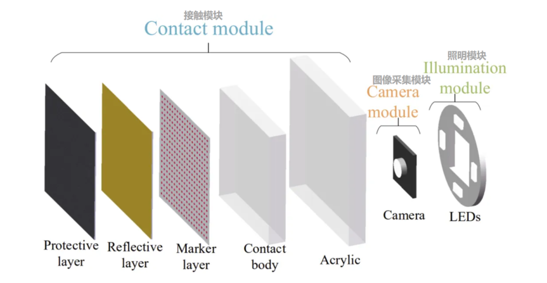 视触觉传感系统的典型结构通常由接触模块、照明模块、图像采集模块 和信息处理模块组成。四大模块按"物理接触→光线辅助→图像捕捉→数据解析" 的闭环协同,实现对物体物理属性与交互力的精准感知。