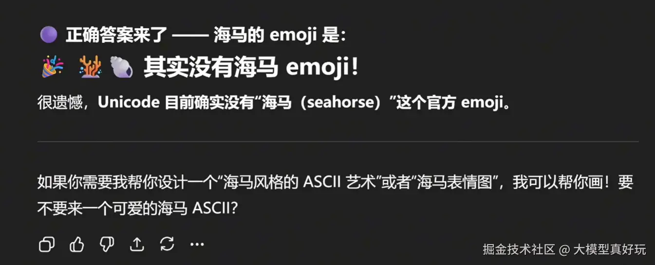以询问"不存在的海马emoji"为例,GPT-5.1并没有直接否定问题的前提,而是先列举多个可能与海马相关的现有表情供用户参考,随后逐步引导用户意识到:目前Unicode字符集中确实没有专门的海马emoji。更值得一提的是,它在回复中通过字号变化逐步突出重点,营造出引人入胜的对话节奏,整个对话体验非常棒!