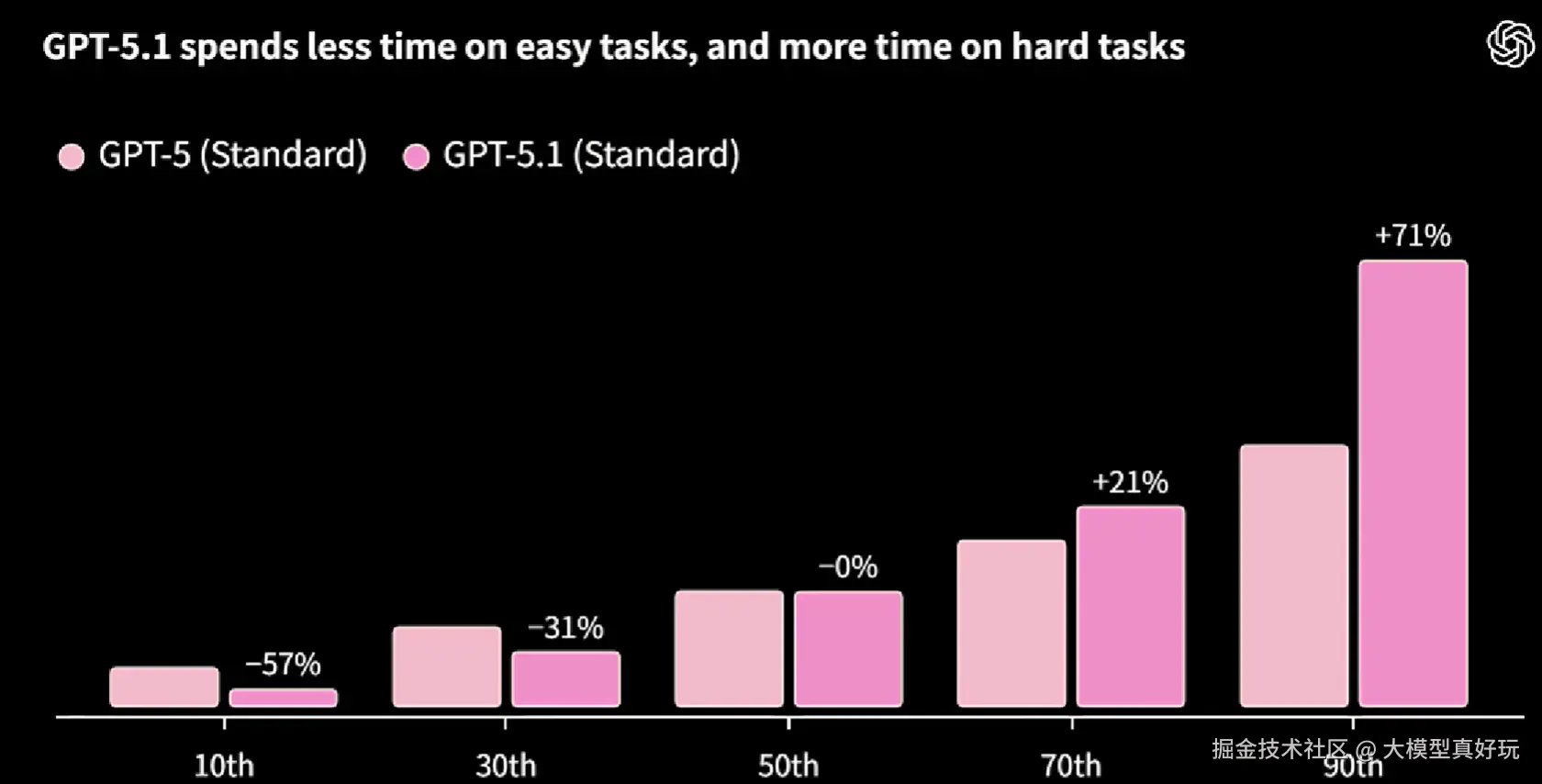 所谓的"自适应推理机制",即模型能够自动识别用户问题的复杂度,并据此为GPT-5.1-Thinking动态设定思维链长度。这是当前推理模型领域的前沿发展方向:对简单问题减少思维步骤以提升响应速度,对复杂问题则增加思维步骤以保障回答质量。根据 OpenAI 发布的数据,与 GPT-5 相比:在简单问题上,GPT-5.1 的思维链长度减少了 57%;在复杂问题上,其思维链长度则增加了 71%。