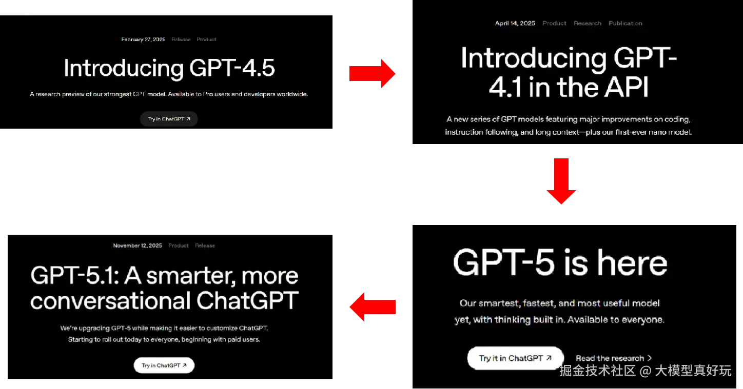 回顾今年,基座模型领域呈现出爆发式的发展态势。笔者曾撰写多篇文章,深入解析了包括DeepSeek系列、Qwen系列和Claude系列在内的主流模型技术演进。而OpenAI作为行业领军者,其更新节奏尤为引人注目:从年初主打高情商对话但成本较高的GPT-4.5,到随后实现降本增效的GPT-4.1,再到在编程推理能力上实现突破但对话体验有所妥协的GPT-5,直至如今实现全面均衡发展的GPT-5.1。这一系列快速迭代,清晰地展现了OpenAI对基座模型最优形态的持续探索。