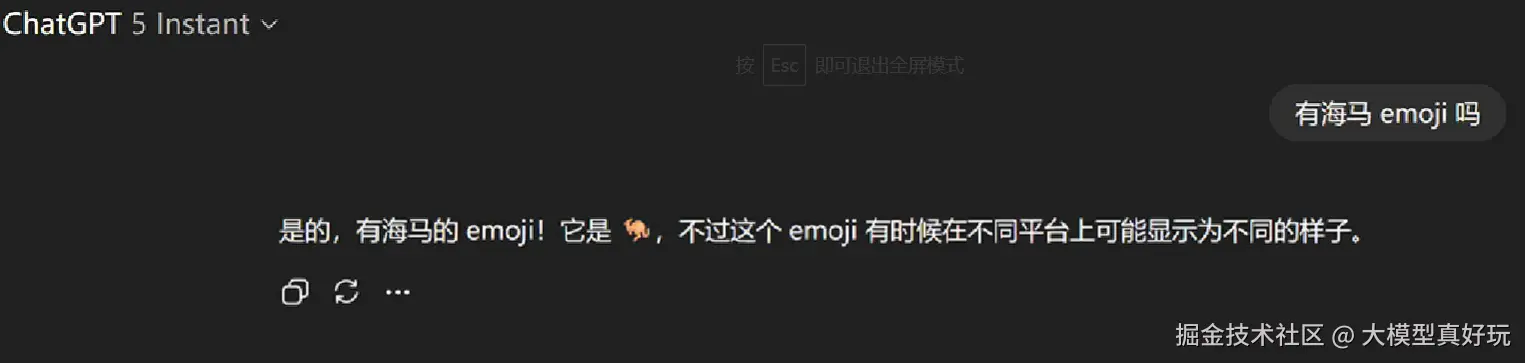 反观GPT-5,不仅回复风格较为生硬,仅给出直接结论,甚至还出现了"幻觉",错误地提供了一个并不存在的emoji作为答案。