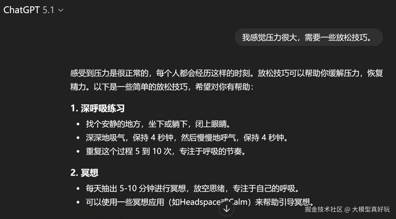 在情感类问题的处理上,GPT-5.1同样展现出更强的共情能力。它会先体察用户情绪,给予安慰,再进一步提供建议;而GPT-5则往往直接输出几条冷冰冰的建议条目。根据笔者多次测试,无论问题是否实际、情绪是否合理,GPT-5.1都能站在用户的角度给予理解与回应,真正做到"人情味拉满"。相信这一提升,将对聊天对话、角色扮演等强交互类应用带来显著体验优化。