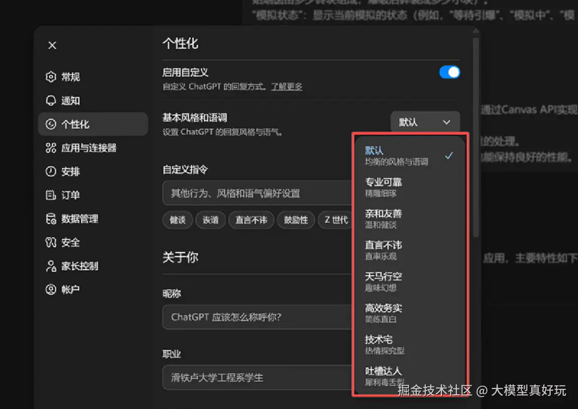 此外,GPT-5.1还内置了多种对话风格,用户可根据场景灵活选用。根据笔者测试,结合不同的语气风格与系统提示词,GPT-5.1能够胜任多种类型的对话交互与文本生成任务,展现出优秀的适应性与可控性。