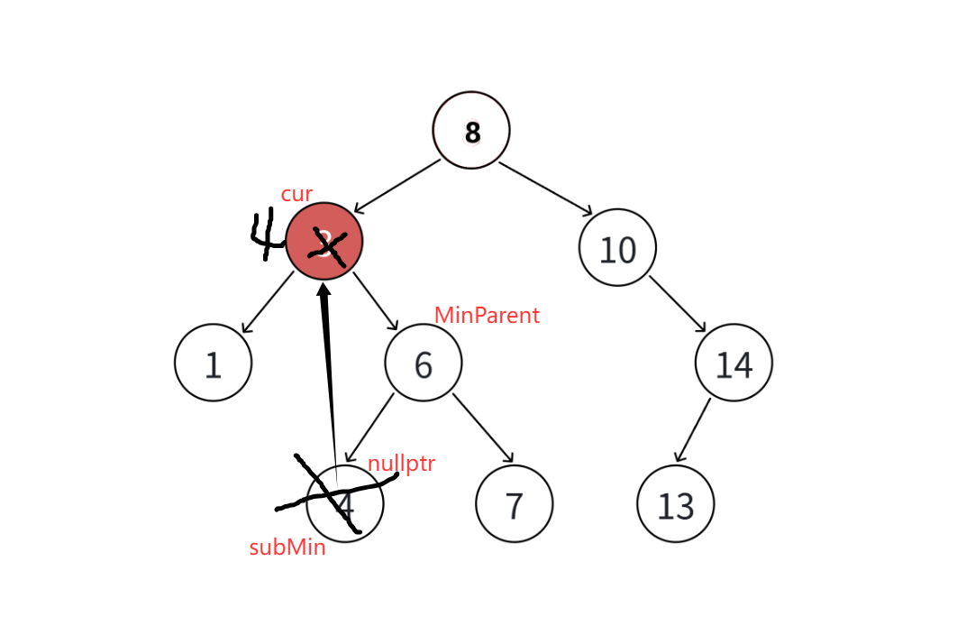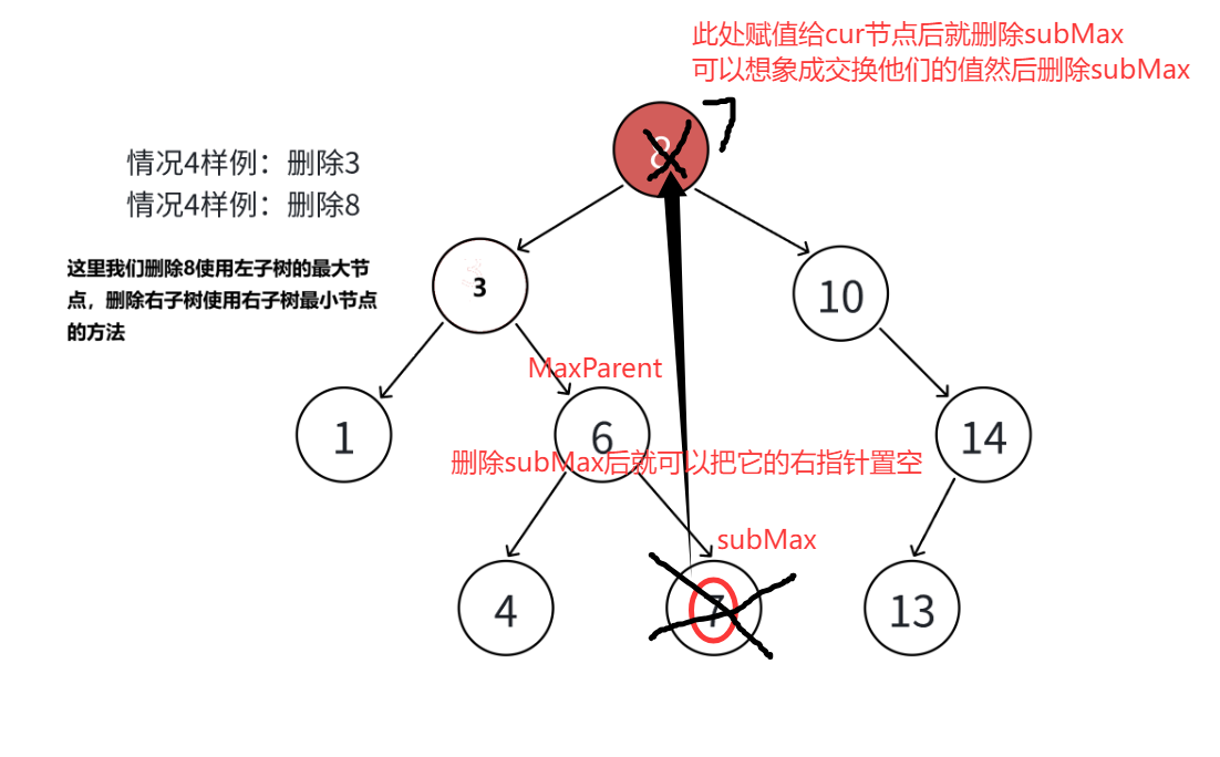 subMAX),把subMAX的_key覆盖到目标节点的_key上------这一步相当于完成了"值替换",将删除两个子节点的复杂场景,转化为删除左子树中maxNode的简单场景。由于subMAX是左子树的最大节点,它的右子树必然为空(最多只有左子树),此时不能直接删除subMAX(它只是局部变量,修改不会影响树的链接),也不能从整棵树根节点开始查找删除,而要从当前目标节点的左子树根节点(root->_left)开始递归,传入subMAX的_key作为查找条件,这样就能精准定位并删除subMAX,最终把复杂删除转化为只有一个或零个子节点的简单删除。- 整个过程中,递归的优势被体现得淋漓尽致:无需像非递归那样用
