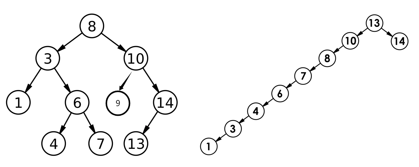 注意:左图为最好情况()完全二叉树,右图基本为最坏情况(单支二叉树)