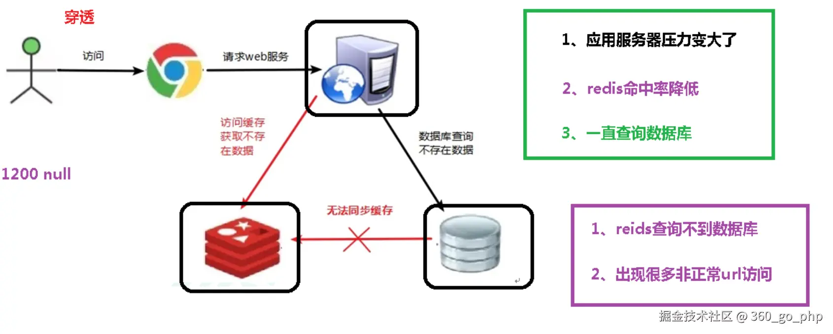 - 缓存穿透 :指查询一个不存在的数据,导致请求直接访问数据库,绕过缓存。解决方法是:可以使用 布隆过滤器 来过滤不合法的请求,避免无效的查询。