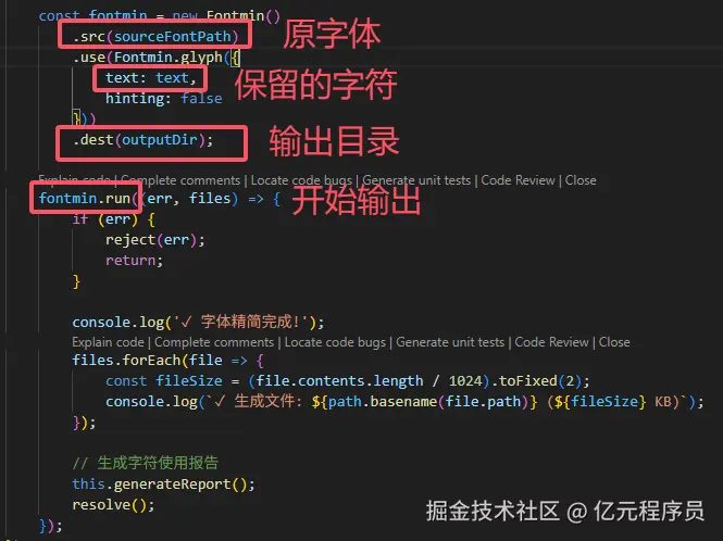 工具 的使用也非常简单,通过传入原字体 、保留的字符 和字体输出目录 ,最后通过fontmin.run这个API生成即可。