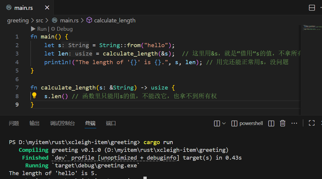 s.len() // 函数里只能用s的值,不能改它,也拿不到所有权