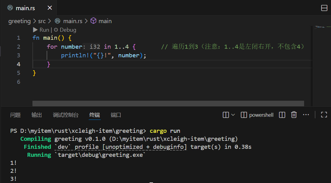 for number in 1..4 { // 遍历1到3(注意:1..4是左闭右开,不包含4)