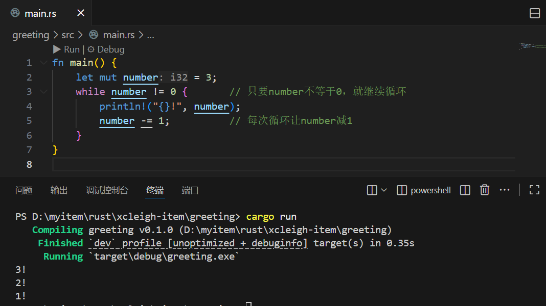 while 循环适合"满足条件就继续跑"的场景,条件不满足了就退出。比如倒计时: