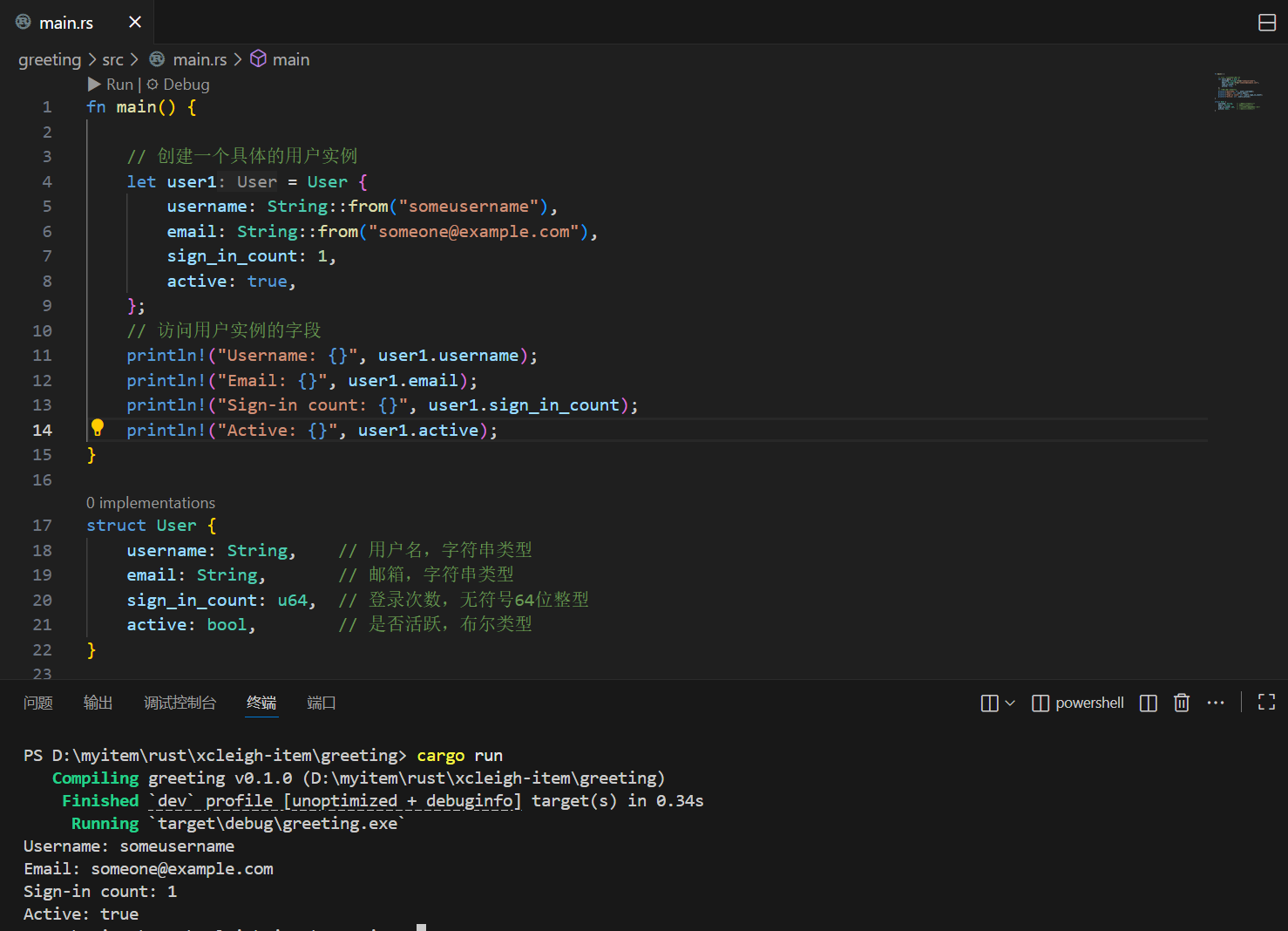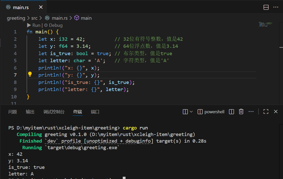 i32:32 位有符号整数u32:32 位无符号整数f64:64 位浮点数bool:布尔类型(只有 true 和 false 两个值)char:字符类型