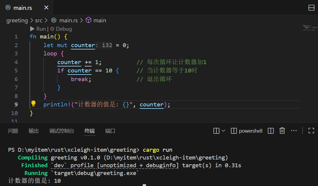 loop 就是 Rust 里的"无限循环",要是不主动退出,它会一直跑。想退出循环,用 break 关键字就行。比如这样写一个计数器: