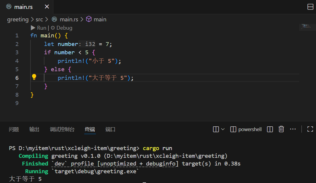 这里 number 是 7,大于 5,所以会打印"大于等于 5"。