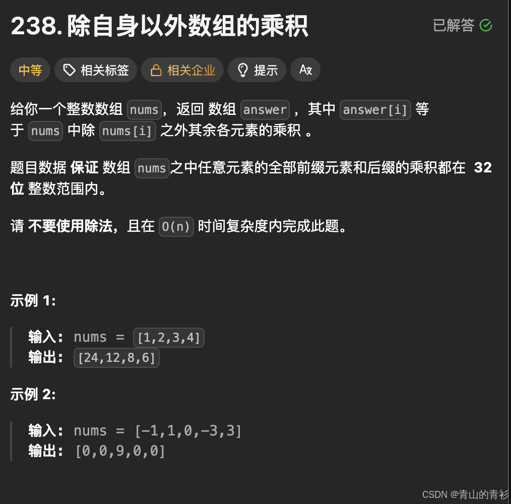 - [LeetCode 238.除自身以外数组的乘积](#LeetCode 238.除自身以外数组的乘积)