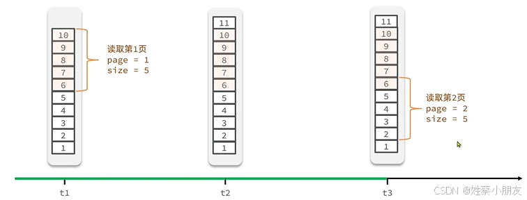 由于SortedSet是有序的,当按照插入时间排序时(当数据有序时 ),若按照下标分页 ,会出现如下问题:t1时刻读取时间最新的5条数据,则第一页数据为6~10。t2时刻插入了一条数据11,此时t3时刻会读取第二页数据,正常应该读取1~5,但是由于中途插入数据导致下标发生变化,导致数据下标混乱(本质) ,会重复的读数据6。如下图所示: