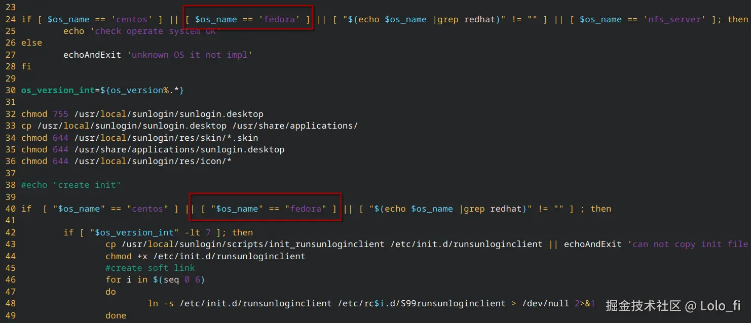 首先修改/usr/local/sunlogin/rpminstall.sh ,找到第24行和40行,添加|| [ "$os_name" == "fedora" ]