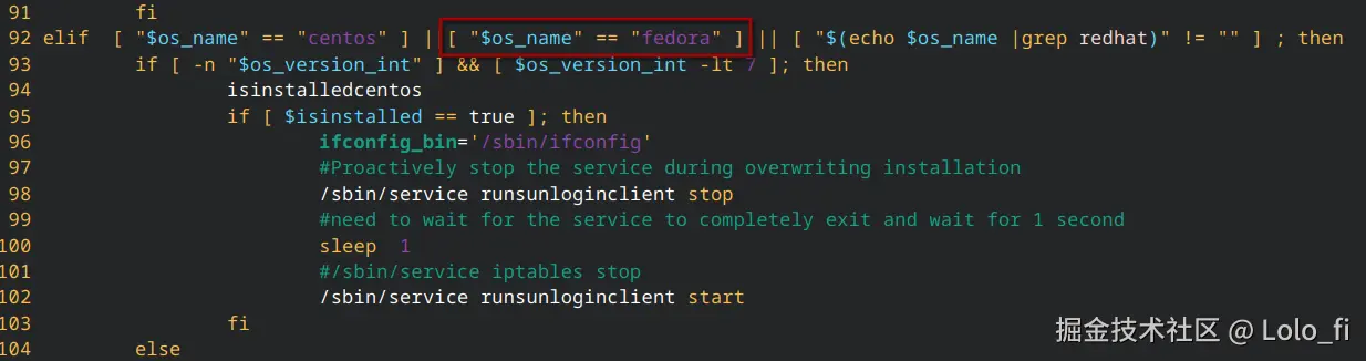 然后修改/usr/local/sunlogin/scripts/start.sh,找到第92行,添加|| [ "$os_name" == "fedora" ]