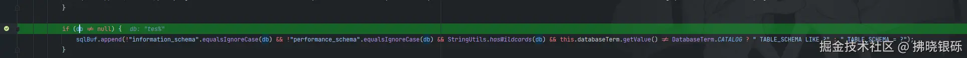而MySQL无论不会特定区分这两种类型,无论是 catalog还是 schemePattern,最终都是TABLE_SCHEMA 区别在于是否可以模糊匹配。 catalog是全匹配,在com.mysql.cj.jdbc.DatabaseMetaDataUsingInfoSchema中下述代码可以得出