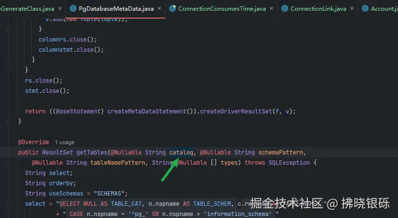 catalog 和 schemePattern 不同的数据库会有不同的实现。Postgresql有模式的概念,而MySQL则没有。PgDatabaseMetaData 不会使用到catalog参数,下图对应的参数在其实现上并没有使用,所以传入什么都是无效的。