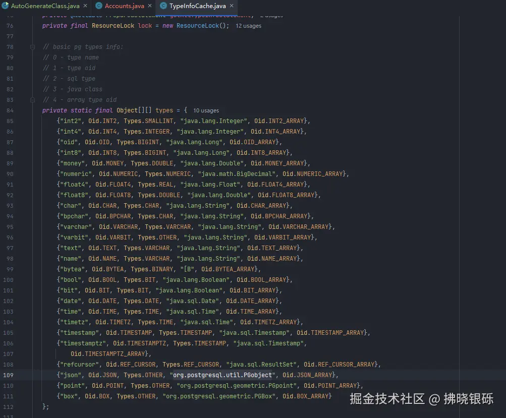 下面是Postgresql 中对应的数据类型,值得注意的是,在开发过程中,我们会使用JSON数据类型,在Postgresql中,其JSON对于的Java类型为其提供的org.postgresql.util.PGobject。