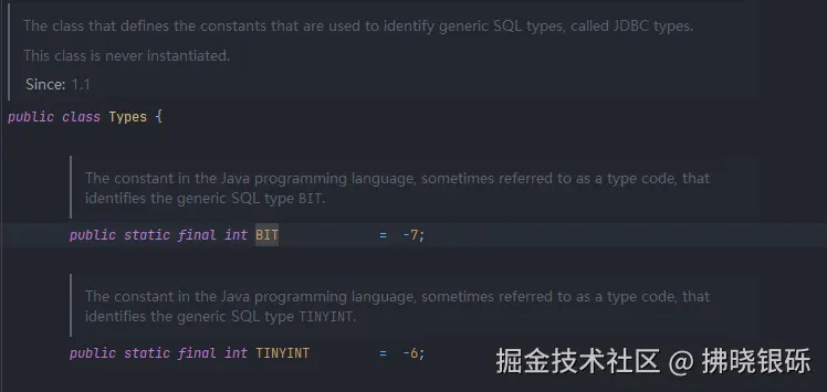我们根据 resultSet.getInt("DATA_TYPE")获取字段的类型值,其对应关系在java.sql.Types类中