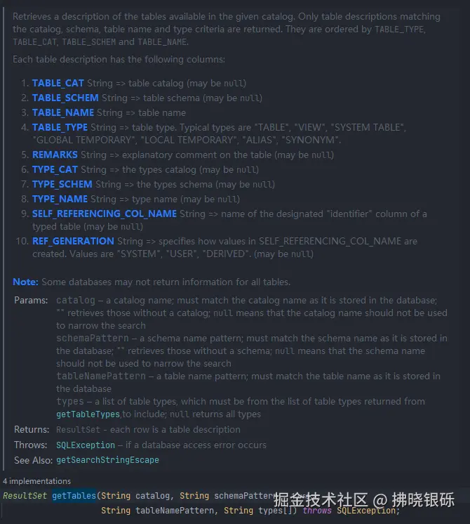 为什么是TABLE_NAME标签 ,进入getTables方法定义中,可以看到其对应的注释,该方法返回表描述的10个字段,其中`TABLE_NAME则是表名称。如下图: