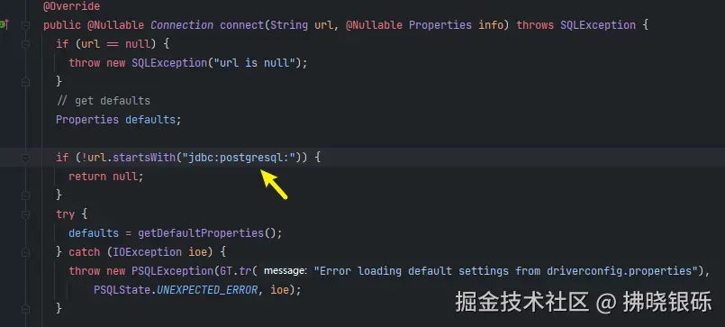 如果匹配,则返回第一个已经匹配的连接。如Postgresql的实现,第一步匹配url来确认是否匹配当前的Driver:
