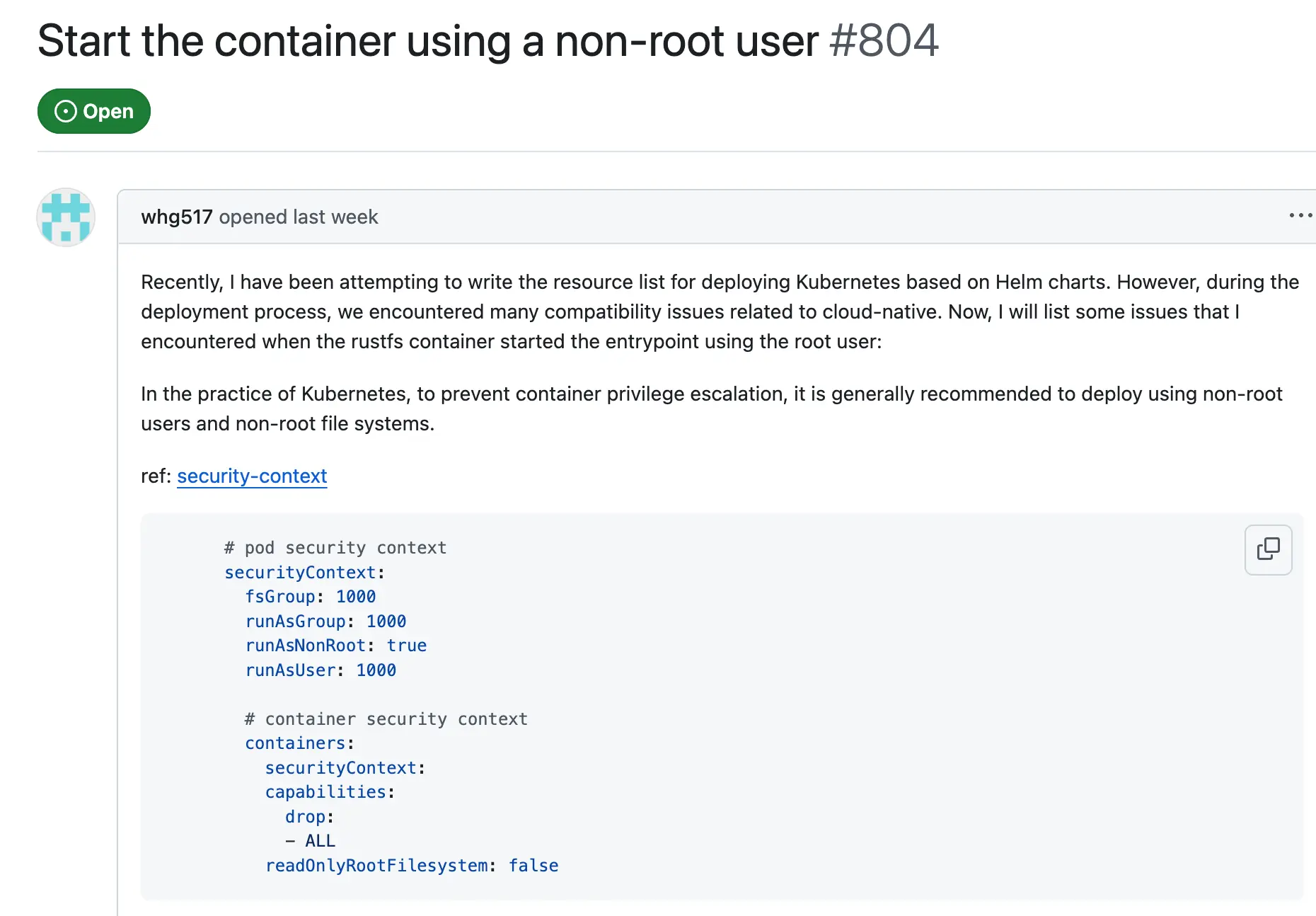 随着 RustFS 的持续走热,越来越多的用户开始关注并使用 RustFS,而且在整个过程中提出了很多关键问题。其中在 Start the container using a non-root user #804中,whg517 用户提出,从安全最佳实践角度出发,RustFS 在容器化运行状态下(包括 docker 部署和 k8s 部署),RustFS 实例应该以非 root 用户运行,并且添加更多安全加固措施。