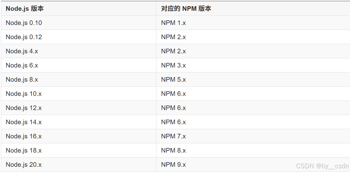 以下是主要 Node.js 版本与 NPM 版本的对照关系: