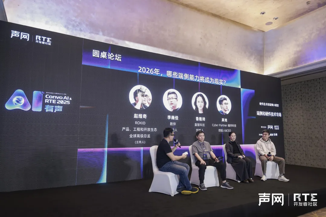 本次主题为「2026 年,哪些端侧能力将成为现实?」的圆桌讨论由 Rokid 全球创新产品、工程和开放生态负责人赵维奇 主持,参与讨论的嘉宾有数伴创始人李巍佳 、盒智科技创始人鲁雅琦 、CyberPartner 魂伴科技创始人&CEO 真地。