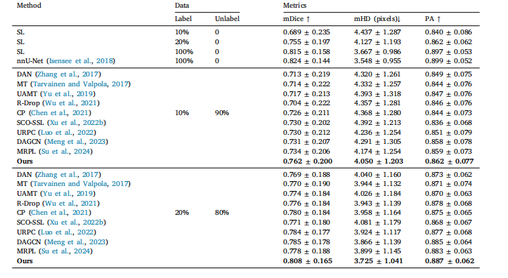 Table 1Comparison results between our method and other semi-supervised methods on F-A4C dataset. Best results are highlighted. SLmeans supervised learning with partial percentages of labeled data.
