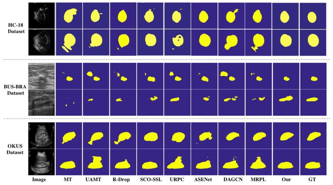 图5. 20%训练样本标注情况下,不同半监督方法在HC-18数据集、BUS-BRA数据集及OKUS数据集上的分割可视化对比结果。GT表示真实标签。