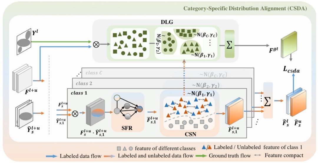 图3. 类别特异性分布对齐(CSDA)的详细架构。该架构包含语义特征强化(SFR)、类别特异性归一化(CSN)和分布标签生成(DLG)三部分。CSN中的双向灰色箭头表示压缩标注数据与无标注数据中同一类别的特征。
