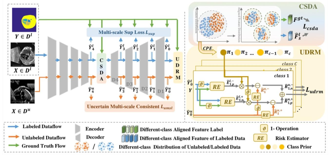 图2. 所提半监督架构总览,包含三部分:(1)金字塔分割网络;(2)类别特异性分布对齐(CSDA);(3)无标记数据风险最小化(UDRM)