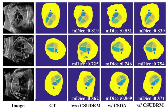 In this section, the proposed method is compared with other stateof-the-art SSL methods on four ultrasound segmentation tasks in Section 5.1. Then, to analyze the effectiveness of our proposed framework,we provide a series of ablation studies in Section 5.2. Finally, Section 5.3 reveals the performance of CSUDRM with different proportionsof labeled images on four ultrasound datasets.