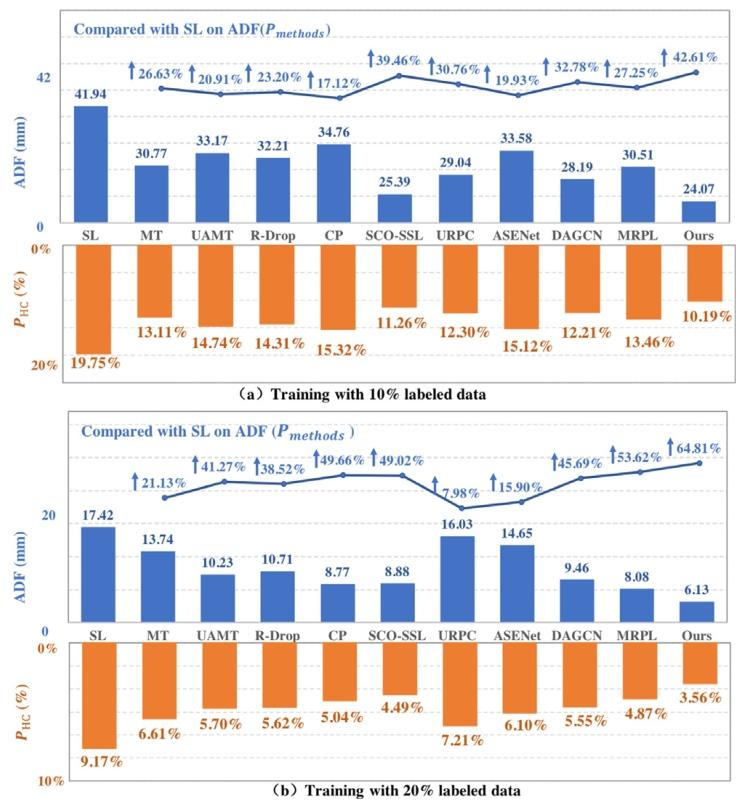 Fig. 11. Results of head circumference on HC-18 dataset. The smaller 𝐴𝐷𝐹and 𝑃**𝐻𝐶 indicate the better performance (represented by column charts), whilethe larger 𝑃𝑚𝑒𝑡ℎ𝑜𝑑𝑠 indicates the better performance (represented by line charts).