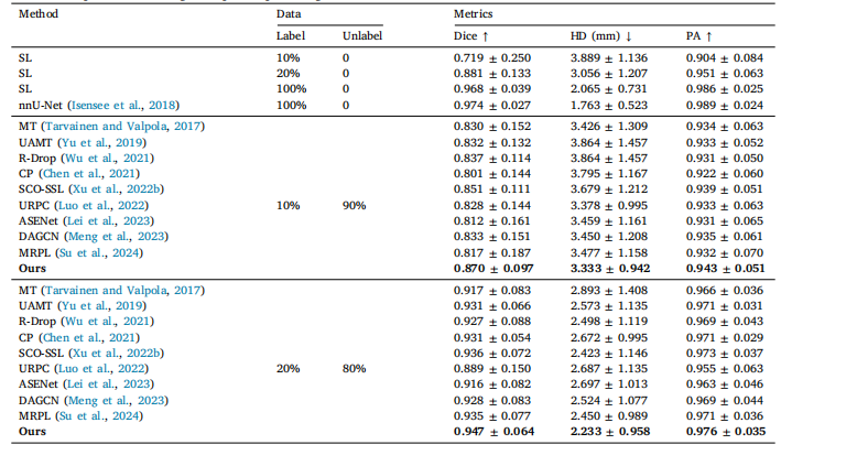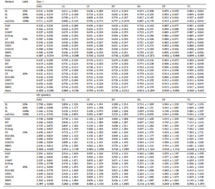 Table 2The results of Dice and HD for seven targets compared our method with other semi-supervised methods on F-A4C dataset. SL means supervised learning withpartial percentages of labeled data. Best results are highlighted.