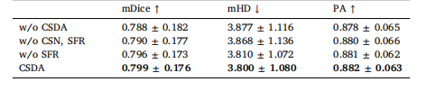 表9 类别特异性分布对齐(CSDA)模块在F-A4C数据集全监督分割任务中的实验结果。