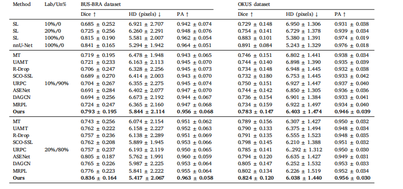 Table 5Comparison results between our method and other semi-supervised methods on BUS-BRA dataset and OKUS dataset. Best results arehighlighted. SL means supervised learning with partial percentages of labeled data