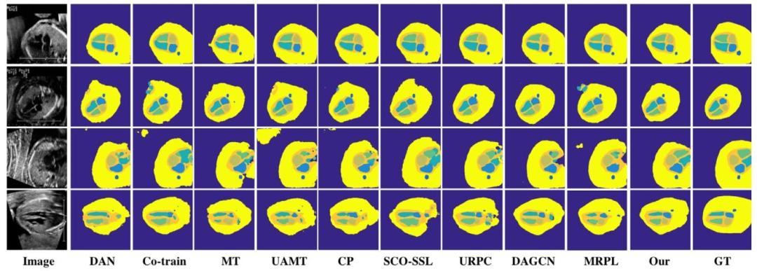 图4. 20%训练样本标注情况下,不同半监督方法在F-A4C数据集分割任务上的可视化对比结果。GT表示真实标签。