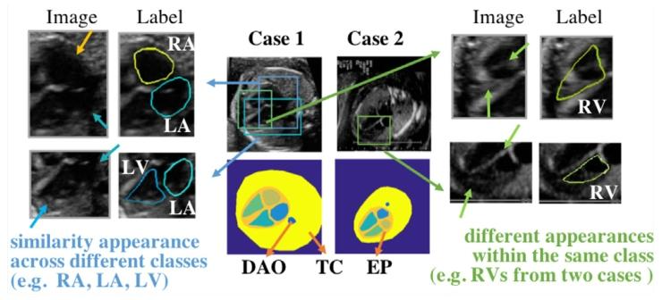 Fig. 1. Two examples of ultrasound obstetric fetal apical four-chamber viewsand their ground truth. Seven segmentation targets: left atrium (LA), rightatrium (RA), left ventricle (LV), right ventricle (RV), epicardium (EP), thoraciccontour (TC), and descending aorta (DAO)