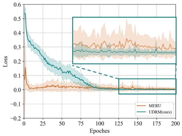 图8. 训练过程中,所提方法与MERU方法中损失项𝑛𝑛̂𝑅𝑢,𝑝+的均值和方差对比图。
