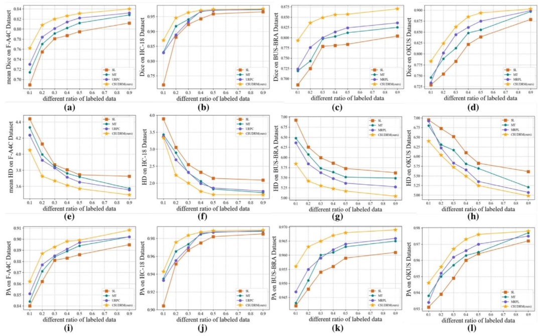 图10. 四种不同方法在不同标注图像比例下的实验结果。(a)--(d) 分别为四个数据集上的Dice系数结果,(e)--(h) 为四个数据集上的HD(豪斯多夫距离)结果,(i)--(l) 为四个数据集上的PA(像素准确率)结果。Dice系数和PA值越高表示性能越好,而HD值越小表示性能越好。