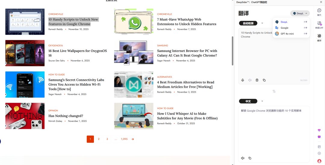 DeepSider还内置了DeepL、谷歌翻译、GPT 4omini三大翻译源,在遇到看不懂的单词或短句时,都可以直接调用侧边栏快速翻译成中文。