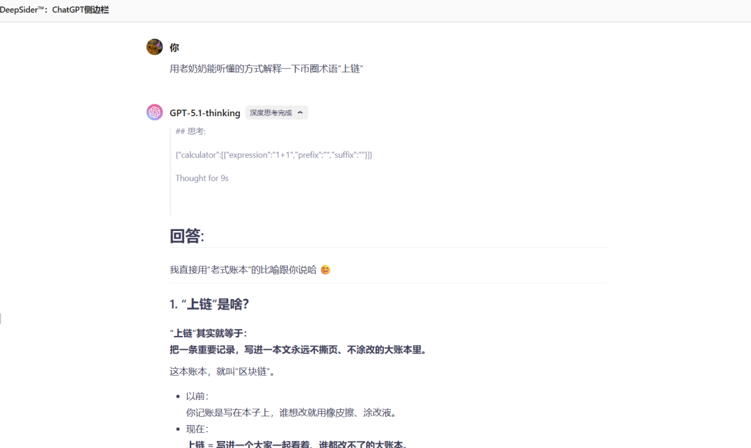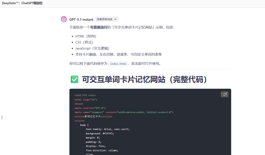 装完插件后,在任何网页上,随时点击右上角的DeepSider图标,就能打开侧边栏选择你需要的模型与AI对话,比如GPT-5.1。