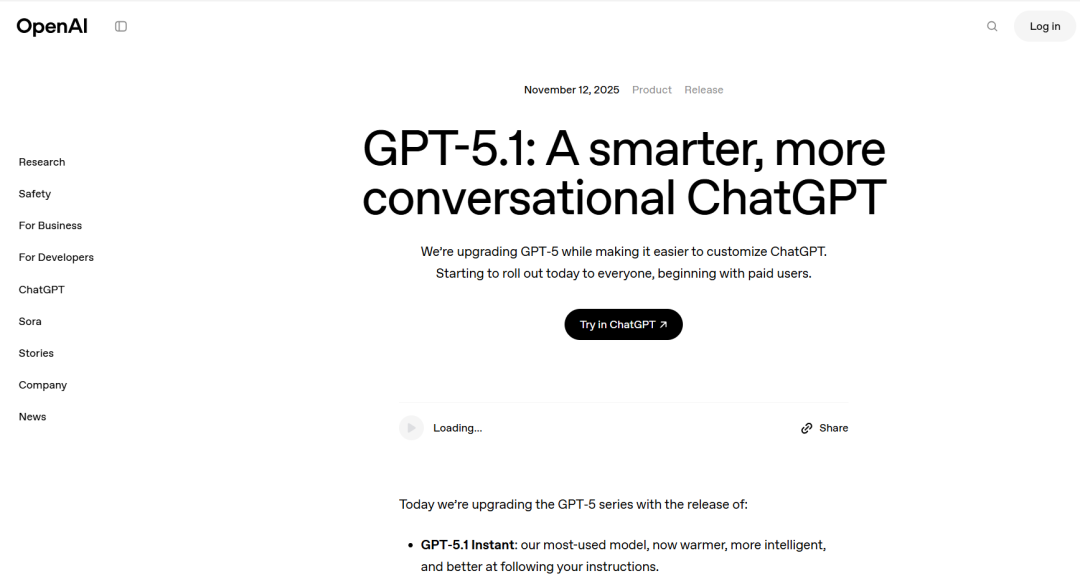 OpenAI重磅发布全新GPT-5.1系列模型,包含GPT-5.1 Instant和GPT-5.1 Thinking两大核心模型。