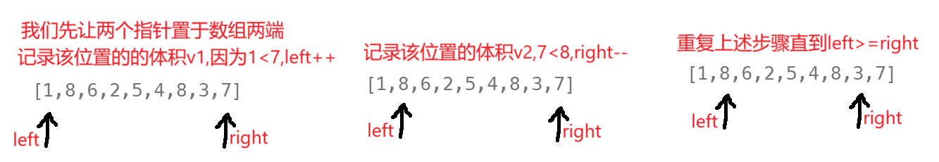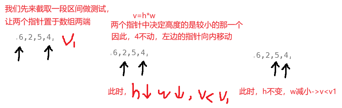 这时,我们就发现了一个规律,当以较小的指针为基另一个指针向内枚举时无论另一个指针指向的数比起始高度大还是小,总体积一直会减小