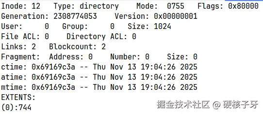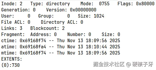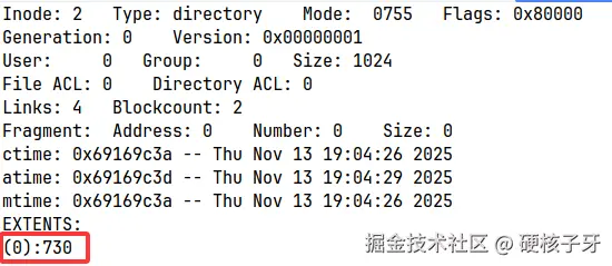 看看inode=2的信息,数据块是block 730。目录的数据块中存储的是什么?子目录的ext4_dir_entry_2